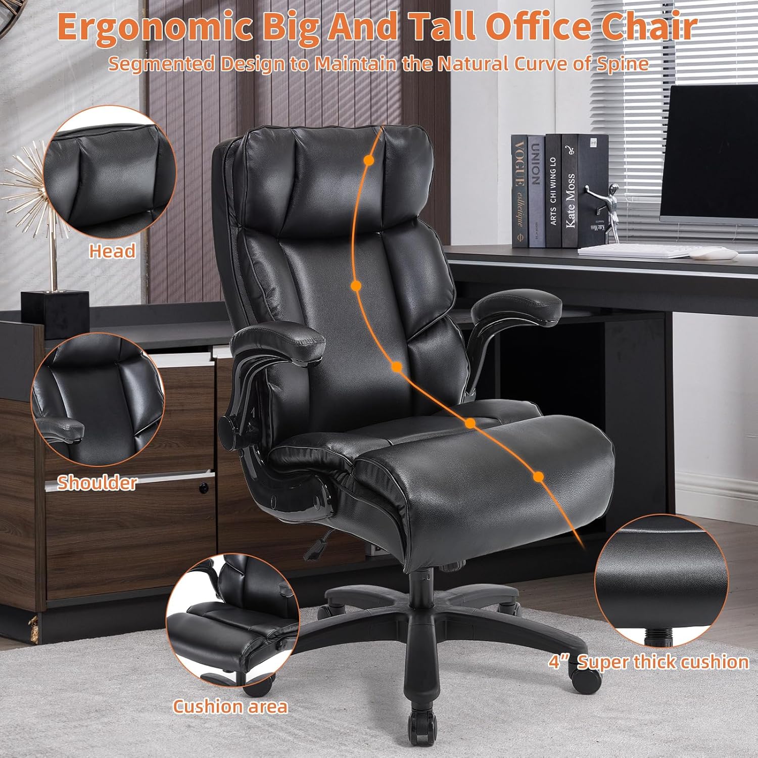 - 𝑪𝒐𝒎𝒇𝒐𝒓𝒕𝒂𝒃𝒍𝒆: Big and tall office chair features scratch-resistant PU leather. Task chair is easy to maintain. Big high back office chair filled with double-layer polyester foam and sponge seat and backrest provide unmatched comfort for all-day sitting.