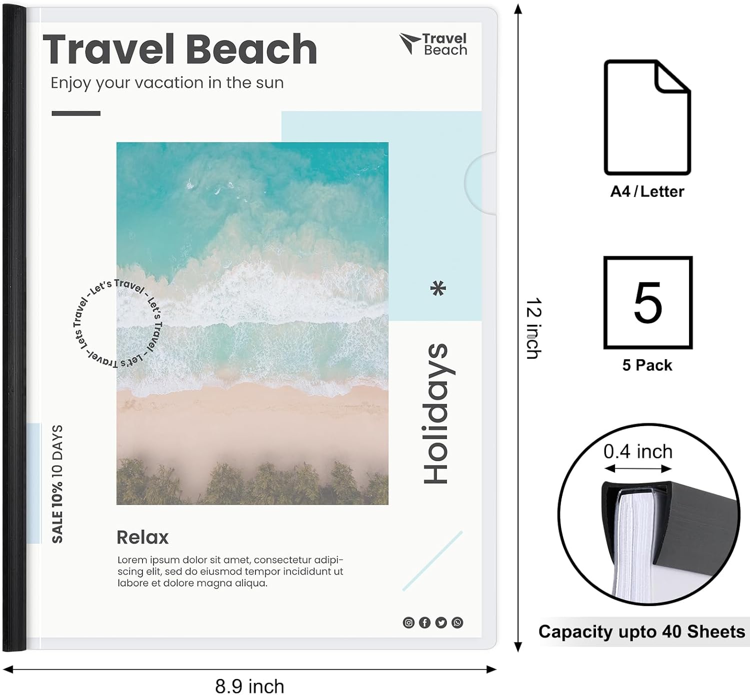 JOERSH 5Pcs Clear Report Covers with Sliding Bar, 40 Sheet Capacity Plastic Binder Paper Protector, Report Folders with Clear Cover for Resume File Documents, Black