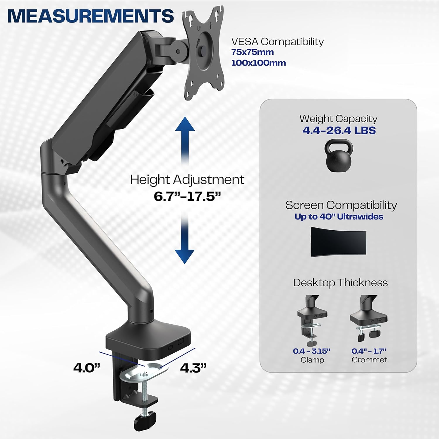 - Fits Ultra Wide Screens: Single mount for ultra-wide monitors up to 40" in size and 26.4 lbs in weight with 75x75mm or 100x100mm VESA patterns. Stand secures to desks up to 3.15” thick with heavy-duty C-clamp or 1.7” with optional grommet mount