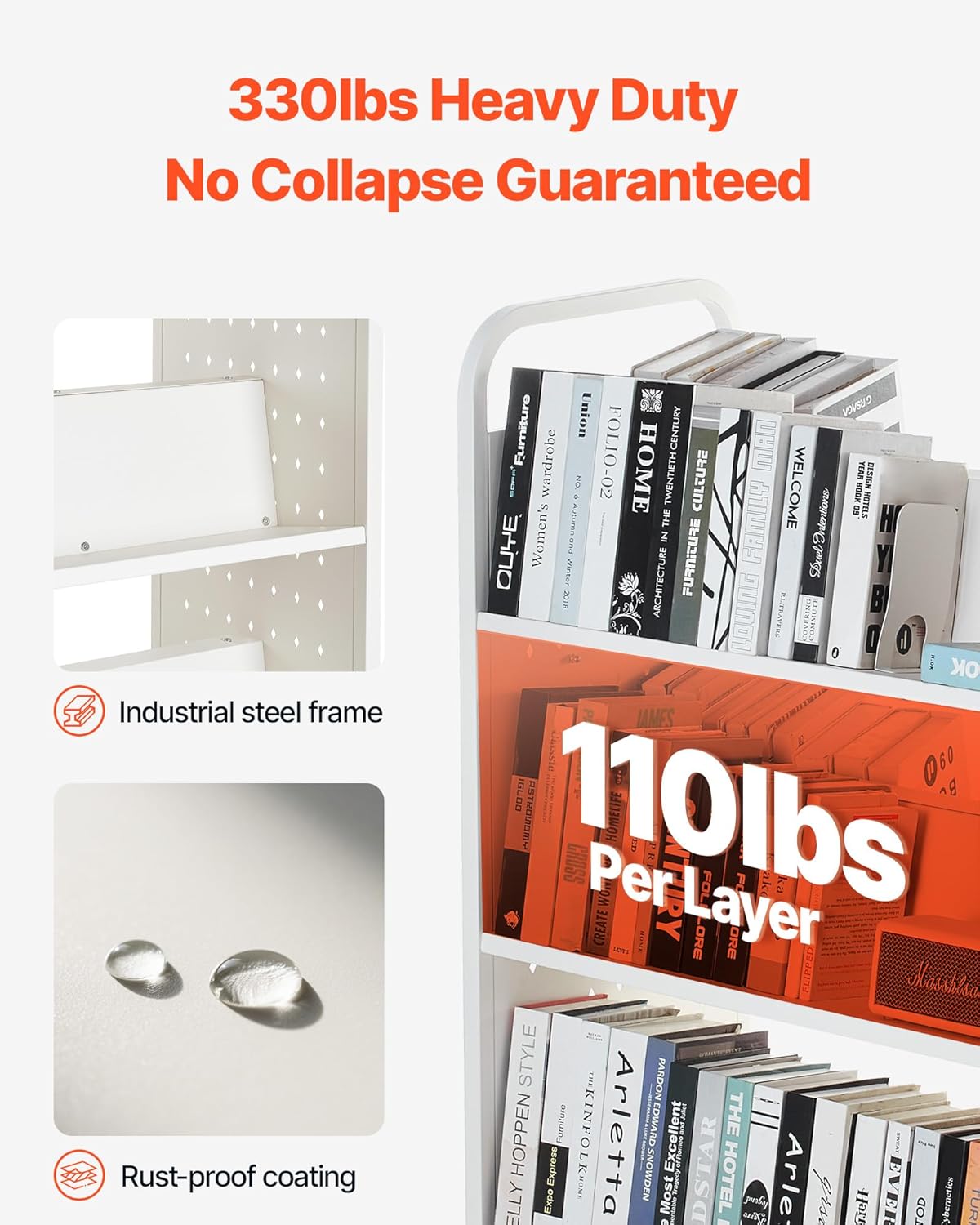 - Stable Load-bearing: Made of high-strength carbon steel, each layer of the rolling book cart supports 110 lbs (50 kg), with a total capacity of 330 lbs (150 kg). The rust-resistant coating ensures durability, ideal for heavy books or equipment