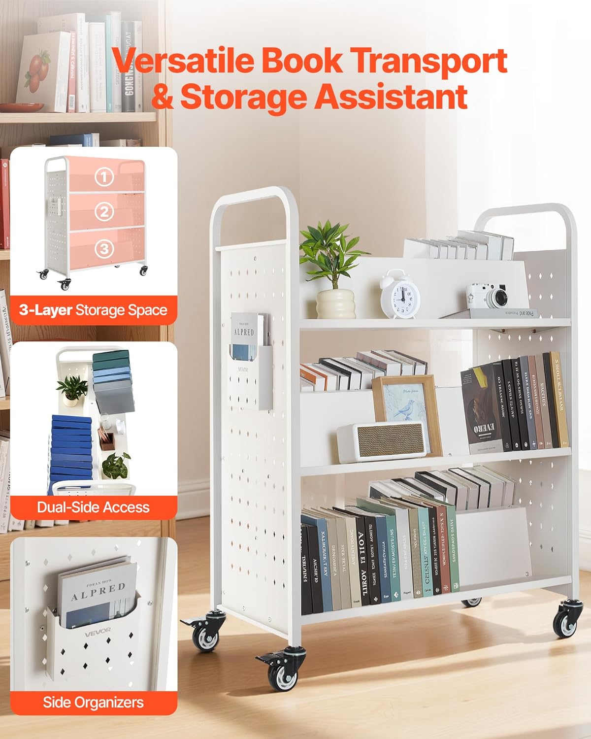 - Silent Movement: TPR silent swivel casters glide smoothly, and two have a locking feature for secure positioning. Move the book truck effortlessly across wood or tile floors without disturbing anyone—great for libraries or nighttime use