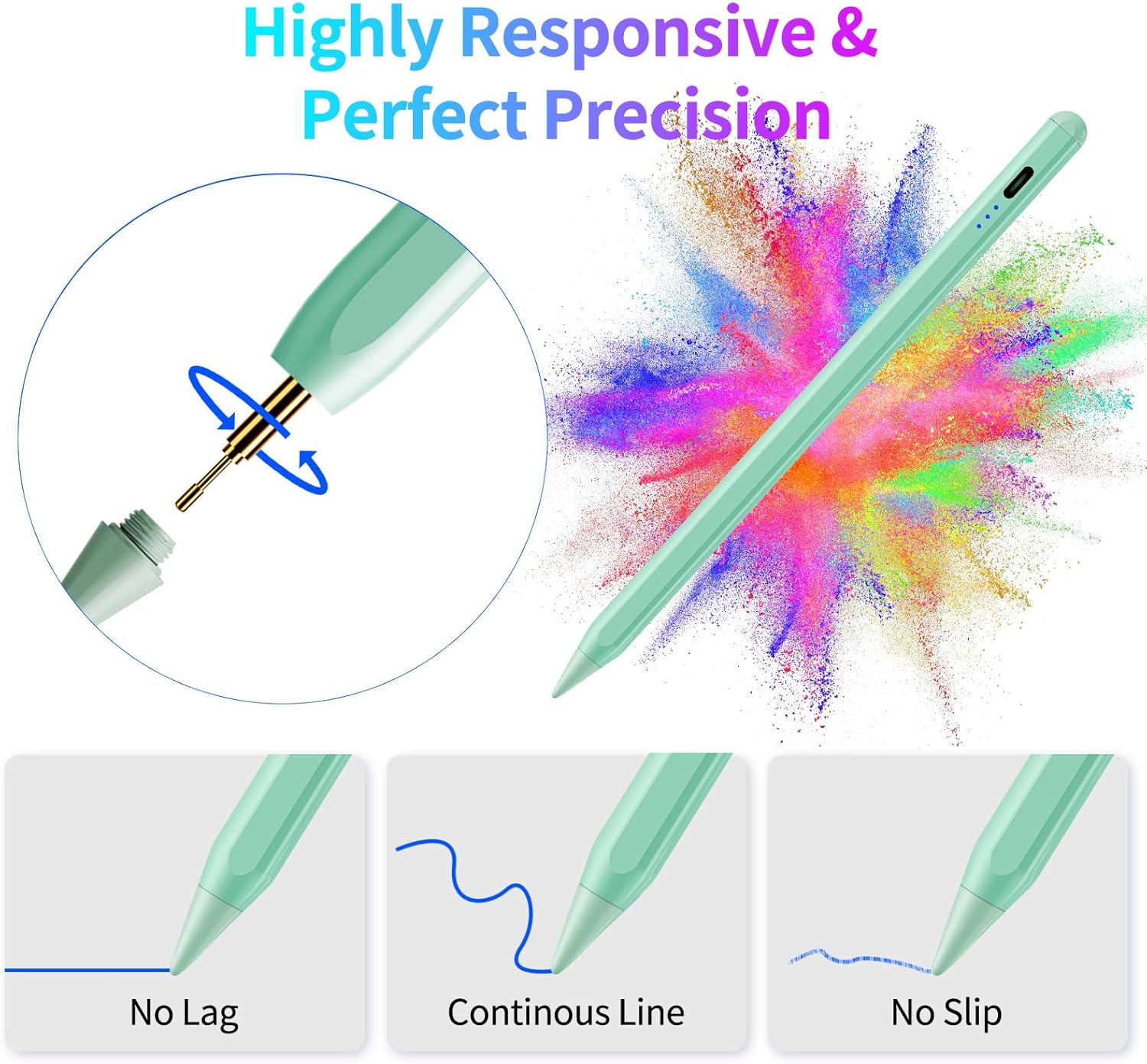 Stylus Pen for iPad, Fast Charging Pencil for Pad with Palm Rejection, Tilt Sensitivity for iPad 6-10, Pro 11"/12.9"/M4, Air 3/4/5/M2, Mini 5/6, Green