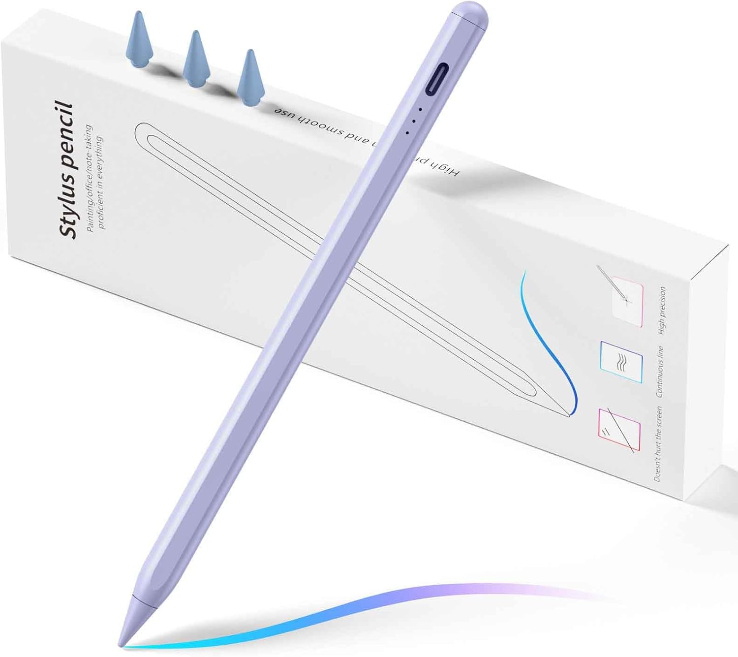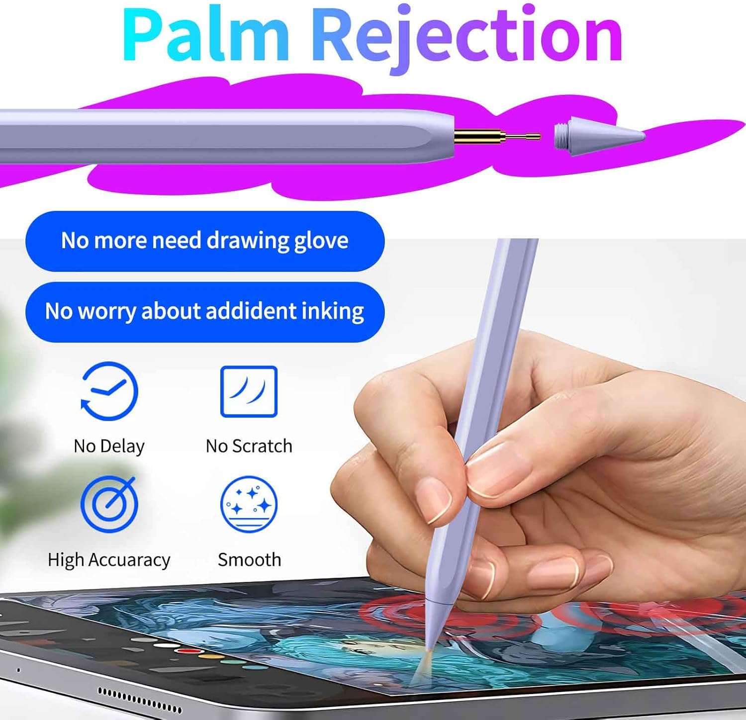 - 【Palm Rejection & Tilt Sensitivity Design】-Stylus pencil for iPad with palm rejection. No need to wear anti-friction gloves, you can take your hand on the screen without worrying about accidental touches. The tilt-sensing technology allows you to draw and write different line thicknesses or shading on the screen based on the angle of the iPad pencil. Suitable for students and staff make writing, drawing and coloring more relaxed and free.Our stylus pen no pressure-sensitive design