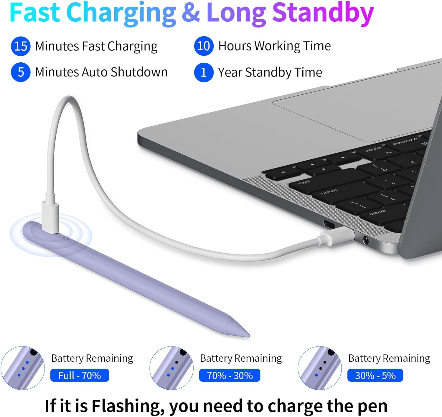 - 【Long Battery Life and Easy to Use】-iPad air pen is charged by Type-C (included), not support wireless charging. Charging for 90 minutes, working for 8-10 hours, standby for 1 year. Idle for 5 minutes and automatically enter "Sleep Mode" to save power. Single press the top button of the stylus to turn on/off easily. If you find it doesn't work after turning on, please turn off Bluetooth, or forget the old pencil: Settings > Bluetooth > Pencil > tap "i" > Forget this device
