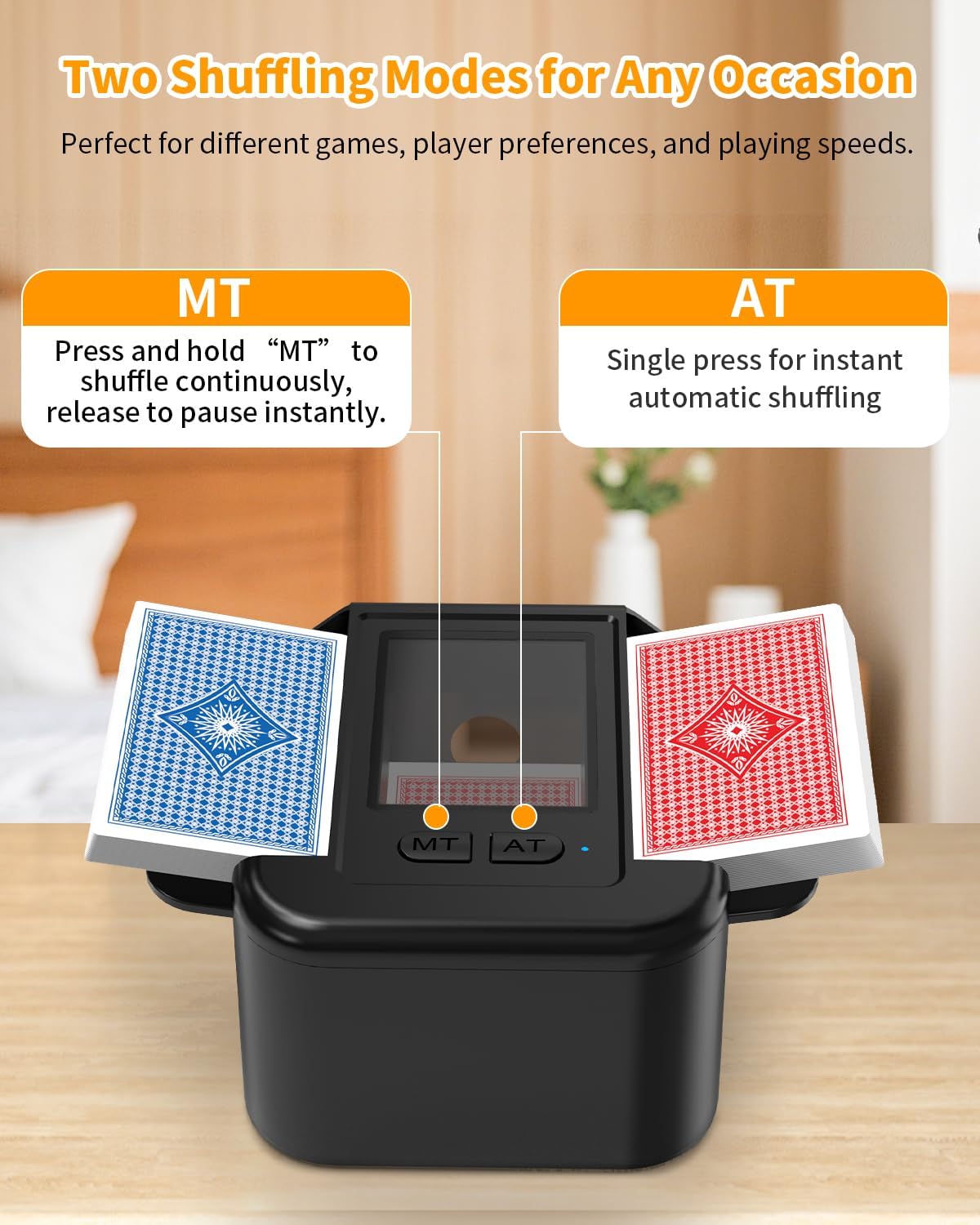 - 【Auto and Manual Work】: Auto card shuffler allow you press the AT button for just 2 seconds to automatically shuffle the cards, press and hold the MT button for continuous shuffling, it's easy to operation