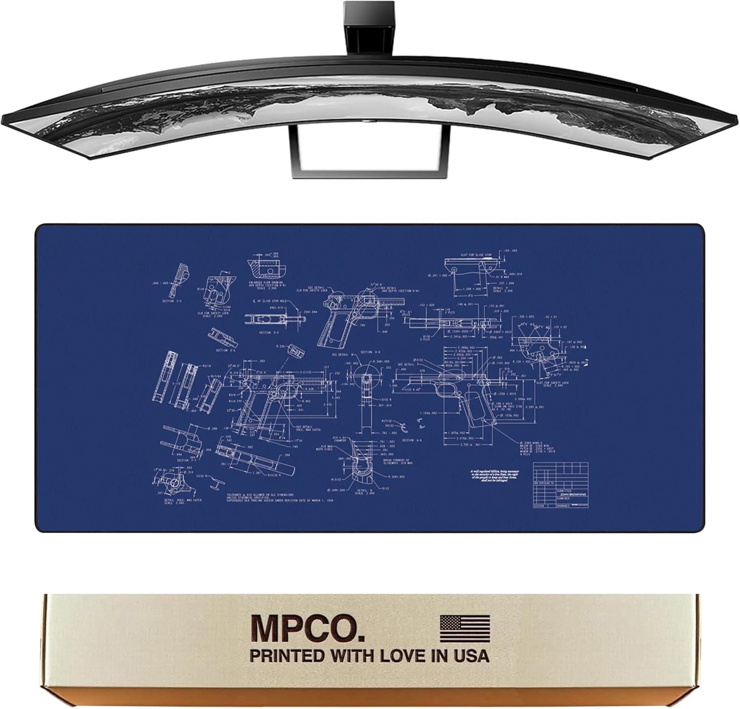 MPCO. Blueprints Large Gaming Desk Pad - 36" x 17" Duraglyde Fabric Browning 1911 – Blue Desk Mats - Non-Slip, Washable, Smooth Glide for Precision Gaming & Work
