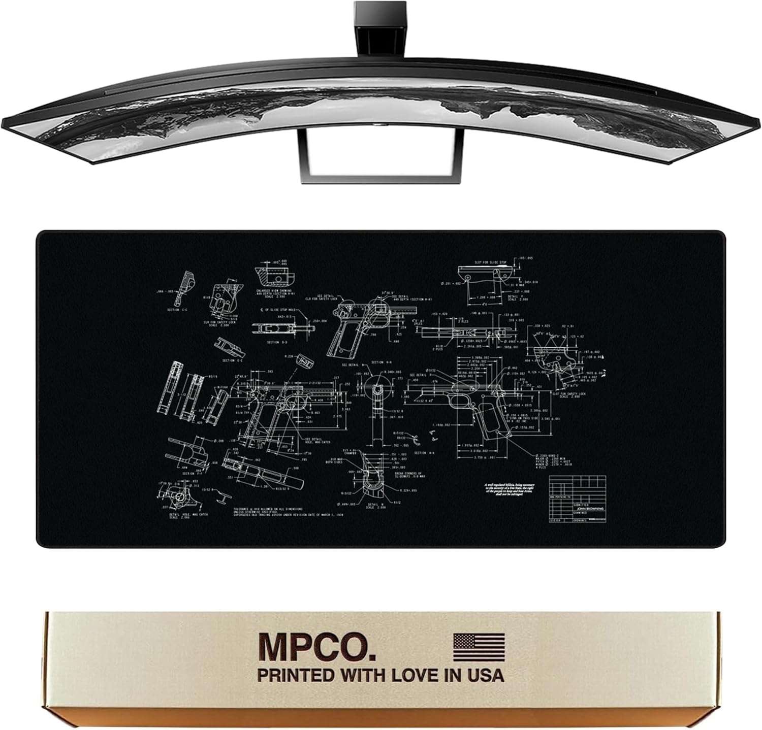 MPCO. Blueprints Large Gaming Desk Pad - 36" x 17" Duraglyde Fabric Browning 1911 – Black Desk Mats - Non-Slip, Washable, Smooth Glide for Precision Gaming & Work