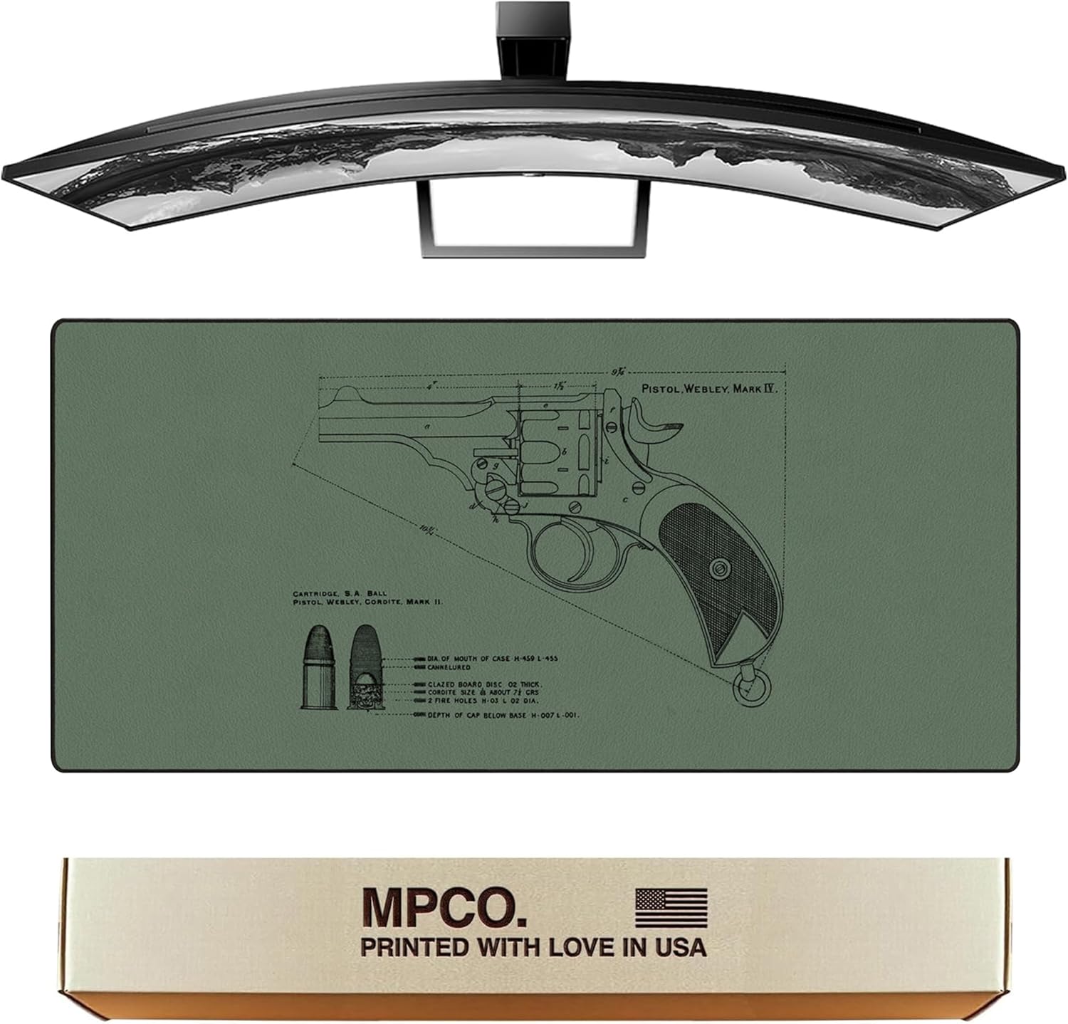 MPCO. Blueprints Large Gaming Desk Pad - 36" x 17" Aeroglyde Fabric Pistol Webly Mark IV – Green Desk Mats - Non-Slip, Washable, Smooth Glide for Precision Gaming & Work
