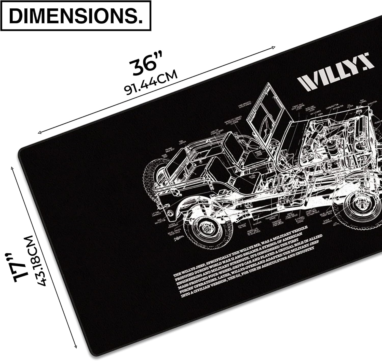 MPCO. Blueprints Large Gaming Desk Pad - 36" x 17" Aeroglyde Fabric Willys Jeep – Black Desk Mats - Non-Slip, Washable, Smooth Glide for Precision Gaming & Work