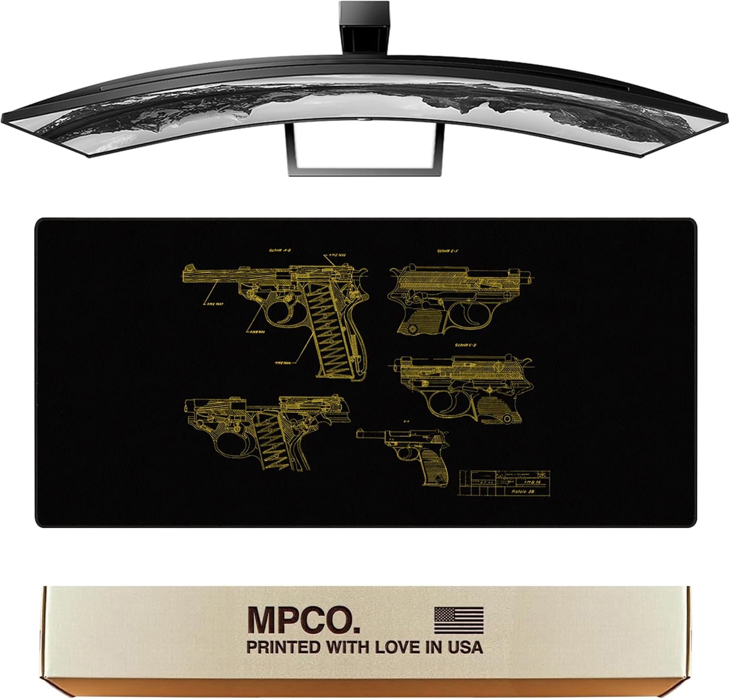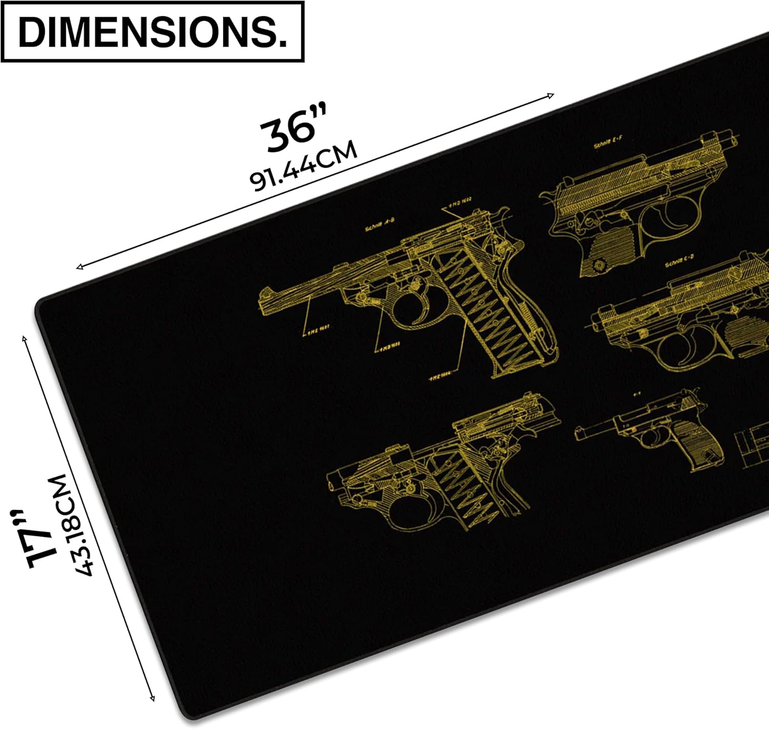 MPCO. Blueprints Large Gaming Desk Pad - 36" x 17" Duraglyde Fabric Pistol 38 – Black/Yellow Desk Mats - Non-Slip, Washable, Smooth Glide for Precision Gaming & Work