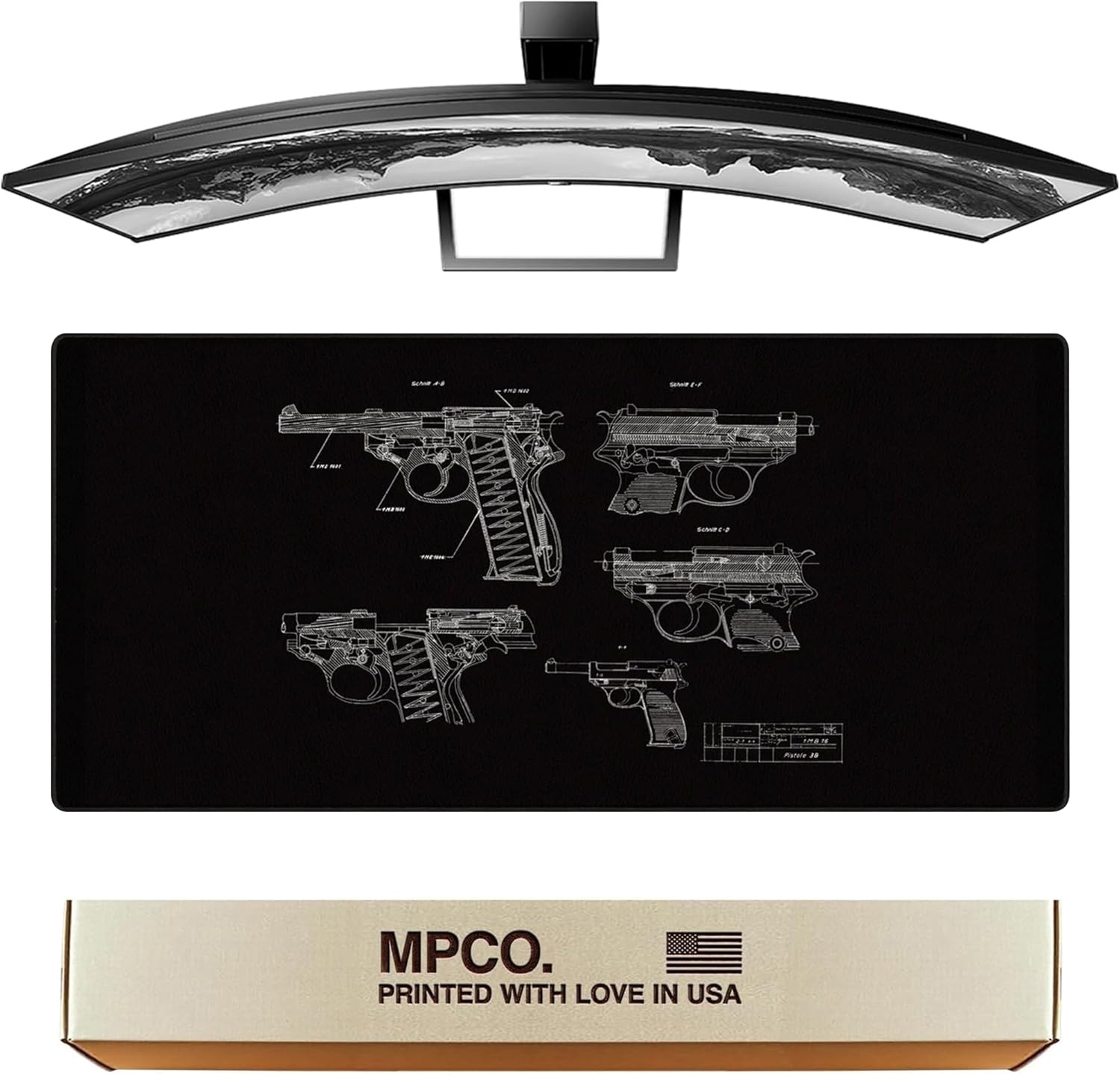 MPCO. Blueprints Large Gaming Desk Pad - 36" x 17" Duraglyde Fabric Pistol 38 – Black Desk Mats - Non-Slip, Washable, Smooth Glide for Precision Gaming & Work