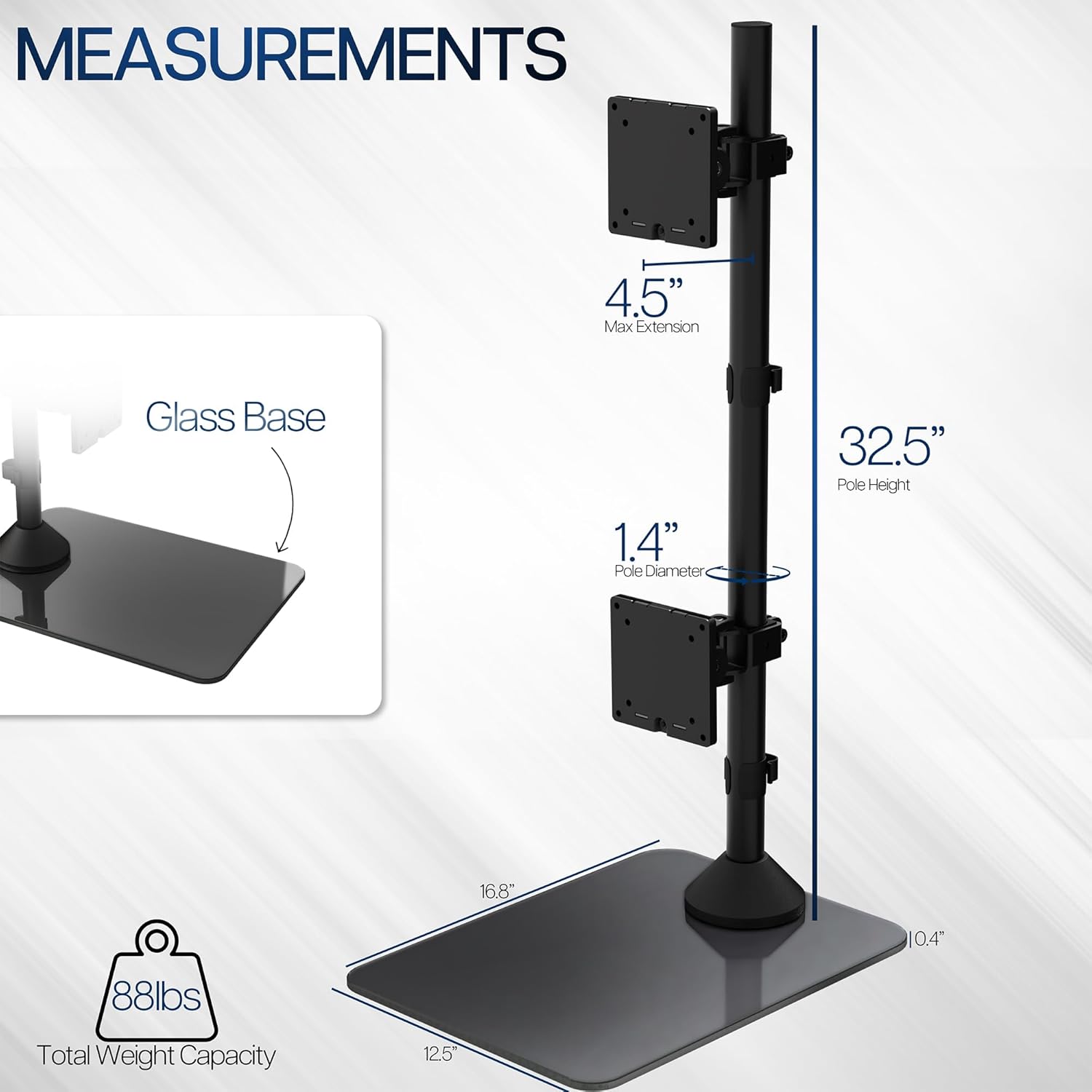 - Tempered Glass Base: Extended 12.5” x 16.8” rectangular base provides added stability and support for your ultrawide setup and features a sleek, elegant glass design to enhance your space