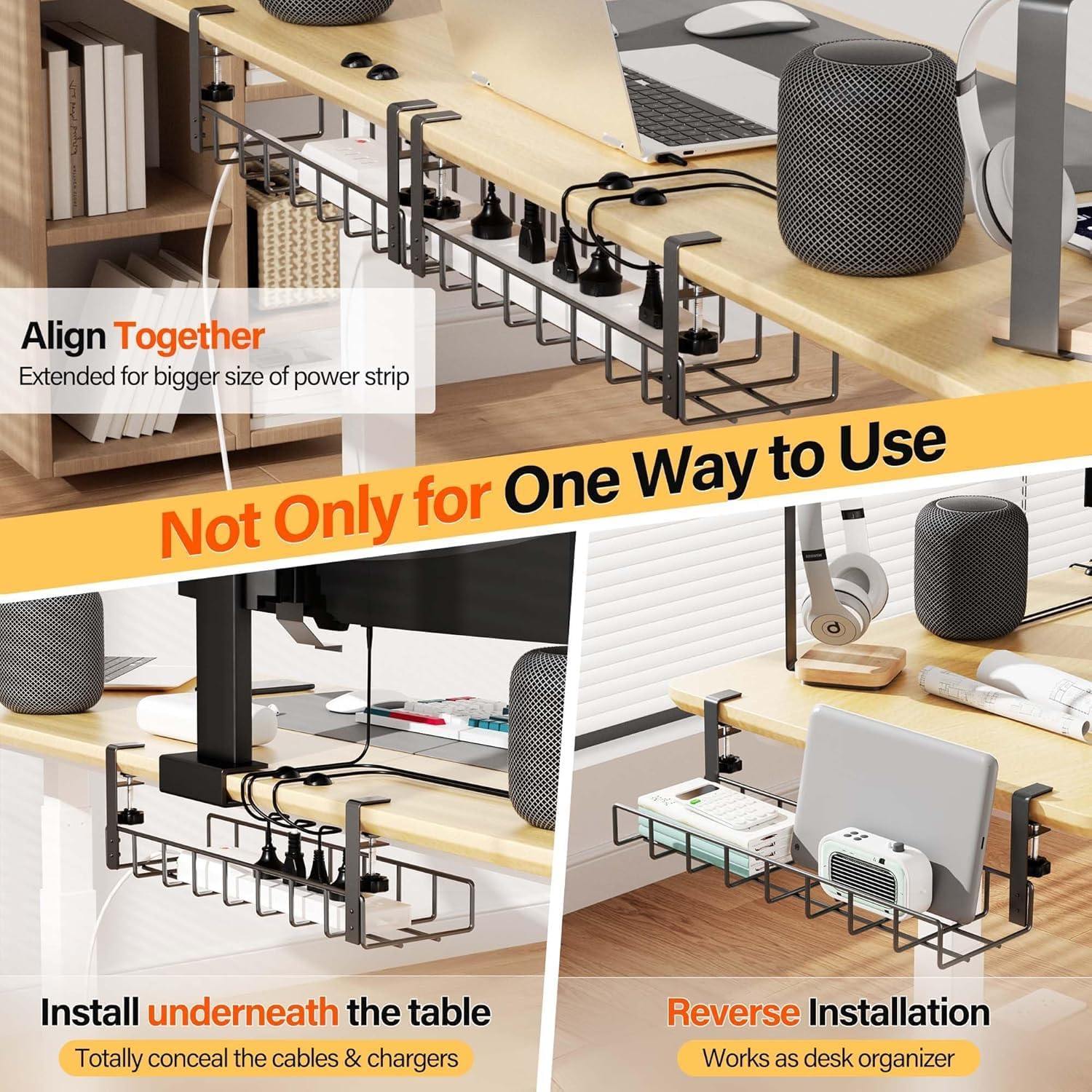- 👍【What You Will Get 】Great value under table cable management kit contains 3 cable trays, 8 cable clips and 4 cable ties. When you place 3 racks align, you will have a extra long 47.1" under desk cable management tray. Suitable for long power strips and multiple devices. This computer cord organizer is great for you not only around your desk table, but also good to be used in the kitchen and outdoors. Tidy and beautify your office and home.