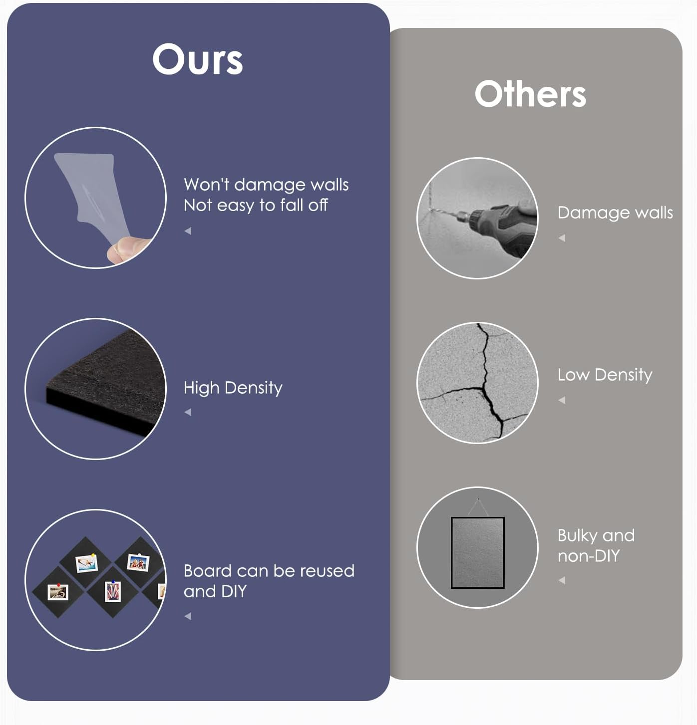 - 【Easy to remove, Repeated use】Communication board does not require drilling and nailing, and the cork board can be quickly installed within 5 minutes. Acrylic adhesives have strong adhesion to hold the panels from falling off from walls, meanwhile, pin boards are safe to be removed without leaving any adhesive residue or damaging your wall paint. Even when moving or redecorating, the wall remains as good as new.The pushpins will not pierce the bulletin board, protecting the wall and safe to use.