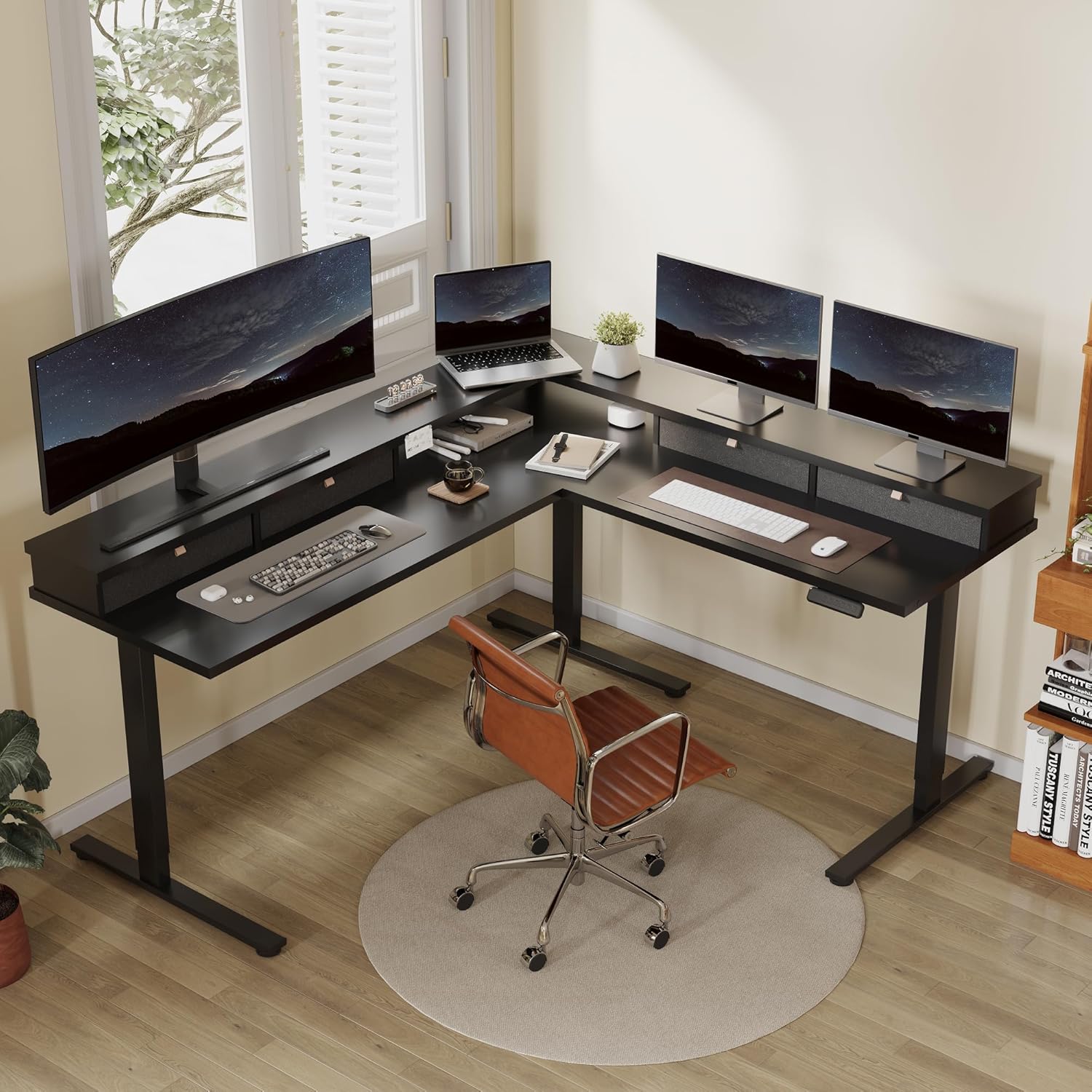 FLEXISPOT 71" Large L Shaped Standing Desk Electric Corner Table with Shelf, 4 Storage Drawers, Adjustable Computer Workstation for Home, Office, Game, Studio, Black Top + Black Frame