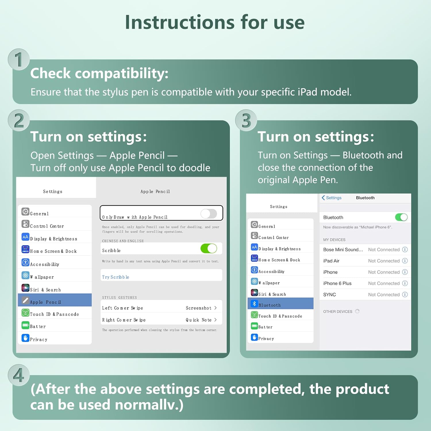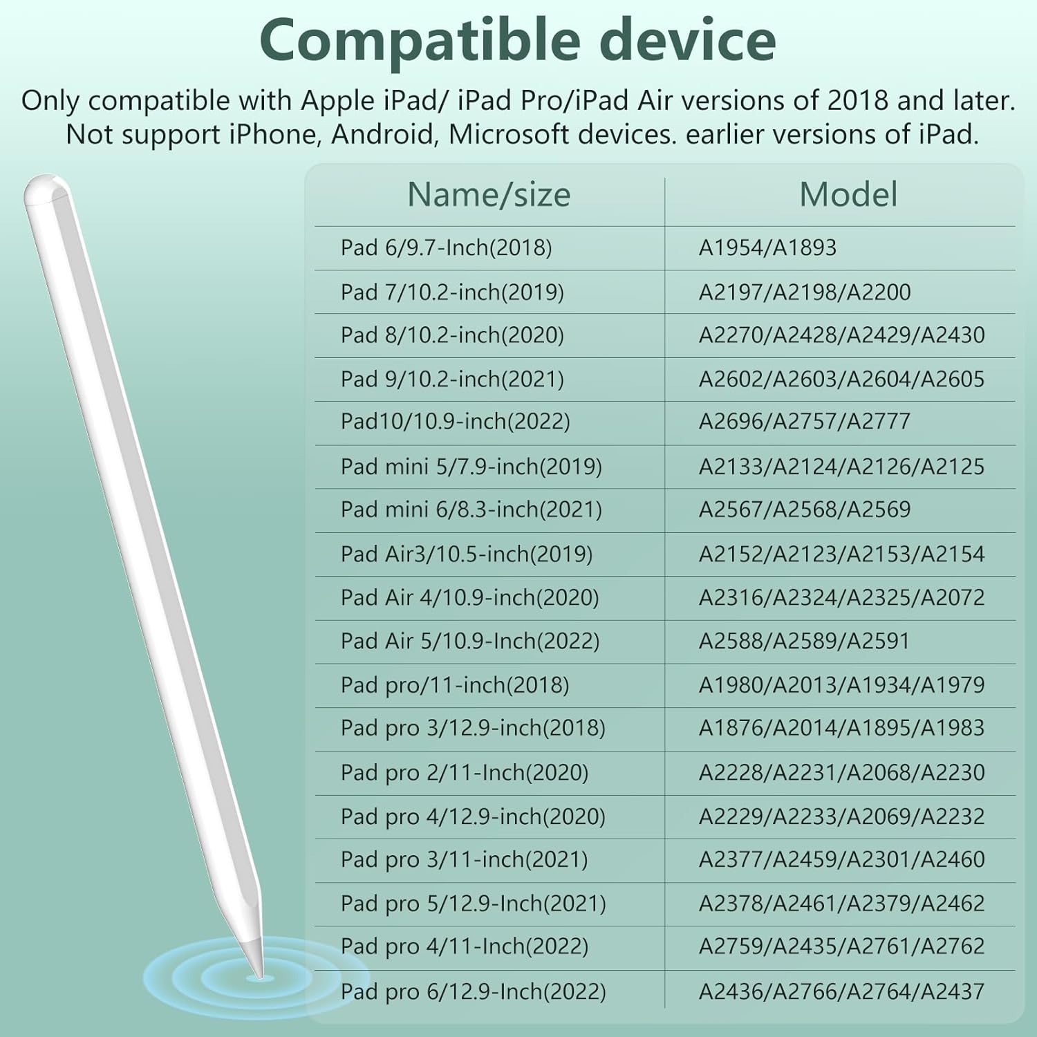 - Compatibility: The pencil is designed for iPad pencil and works with iPad 10th/9th/8th-6th; iPad Pro 11-inch; iPad Air 3-6; iPad Air 5th/4th/3rd; iPad mini 6/5; (Specific compatible models as shown). Note: Compatible with Apple iPad/iPad Pro/iPad Air 2018 and higher only, iPhone, Android, Microsoft devices and earlier versions of iPad are not supported.