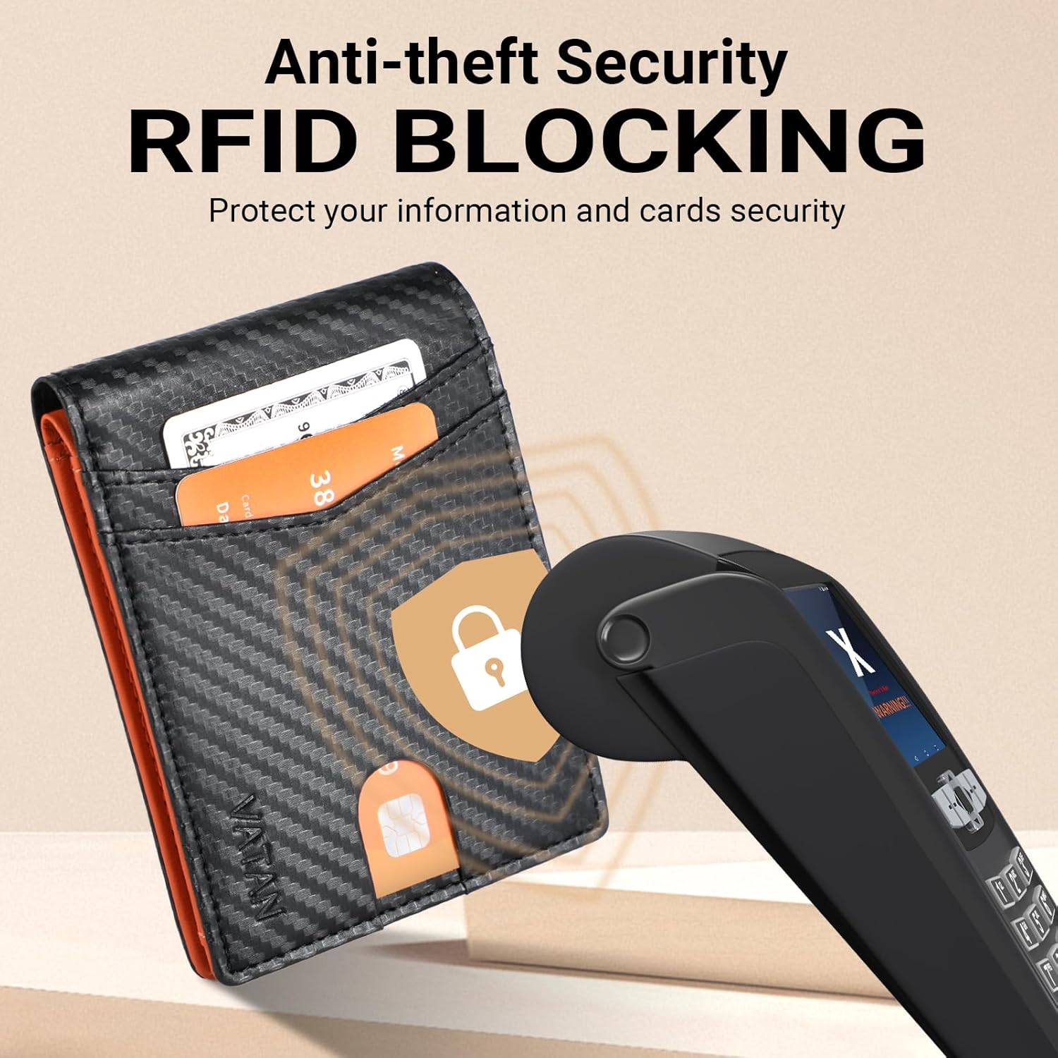 VATAN Wallet for Men, Mens Minimalist Wallet Credit Card Holder, Slim Leather Rfid 2 ID Window Large Capacity With Gift Box (Carbon Black and Orange)