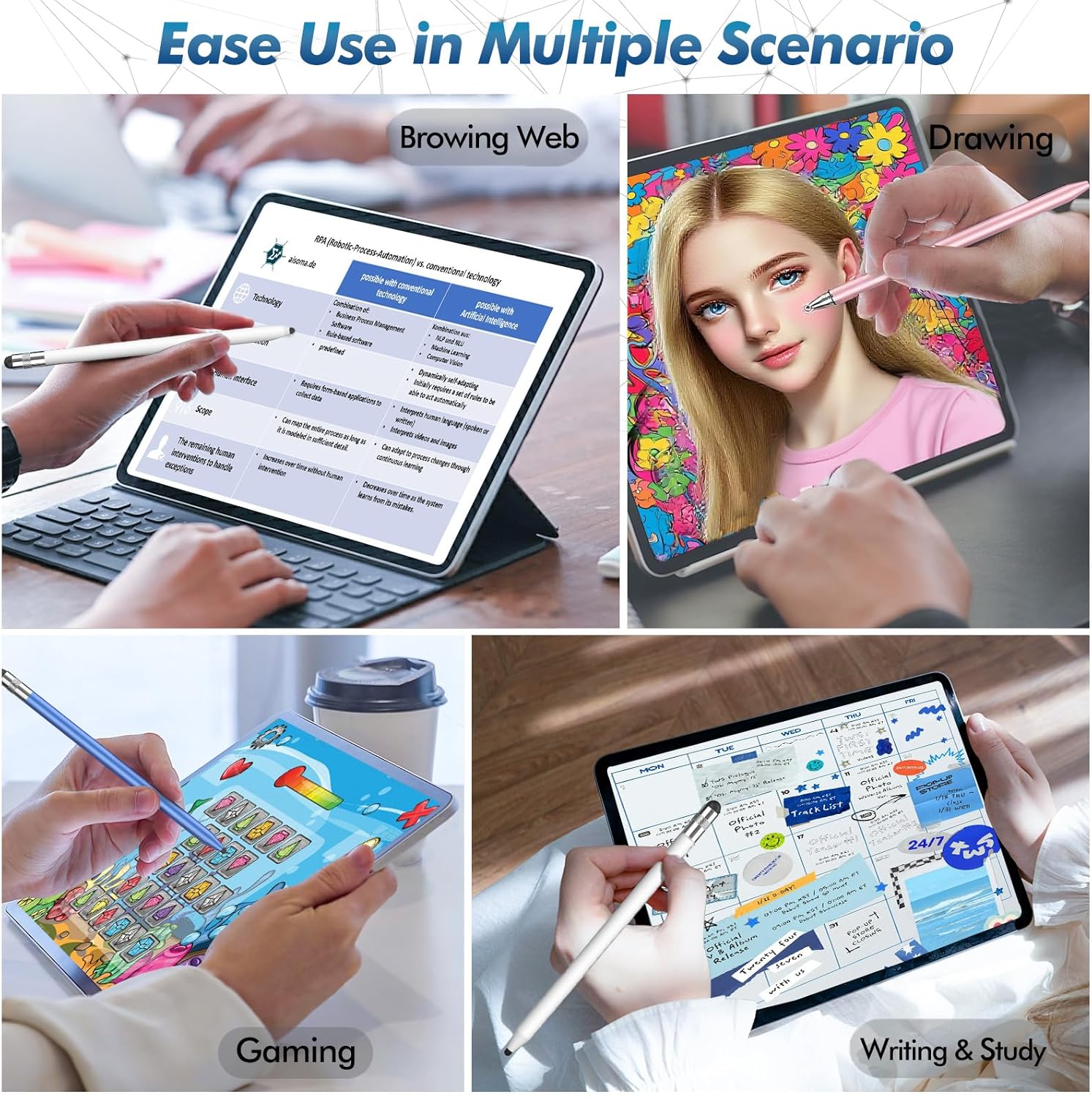 - Tablet stylus for all touch screen: The stylus pen for touchscreen delivers a better touch point than your finger, avoids the troubles caused by accidental touch. It's the perfect tool for kids learning, adults working, and seniors navigating their devices effortlessly