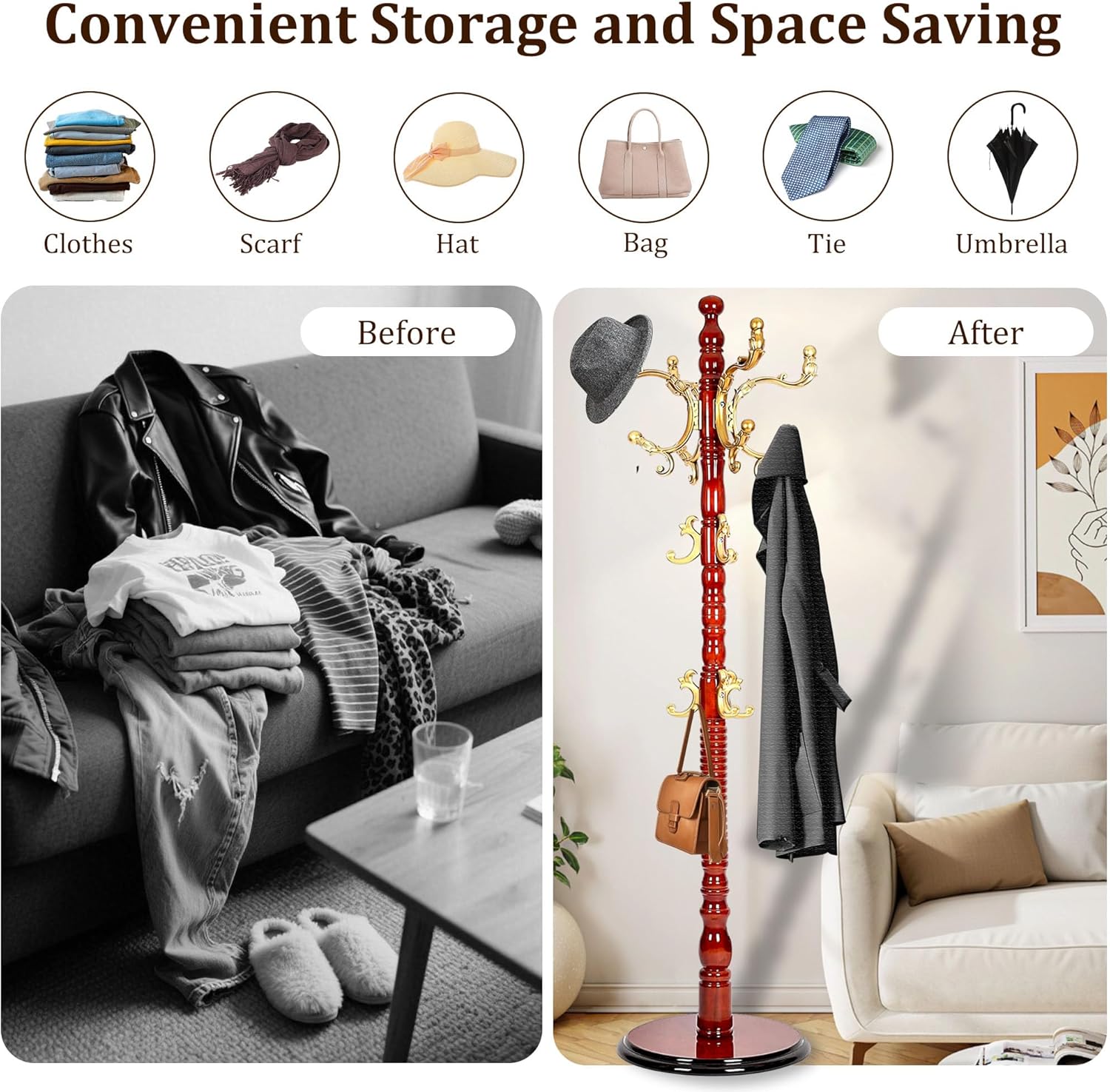 - 【HIGH QUALITY MATERIAL】This modern coat rack crafted from high-quality solid rubberwood, adopt polishing techniques, coated with eco-friendly paints, ensures durability and a stylish addition to any room, perfect for organizing your wardrobe essentials. It fits into living rooms, entryway, bedrooms, offices, and apartment