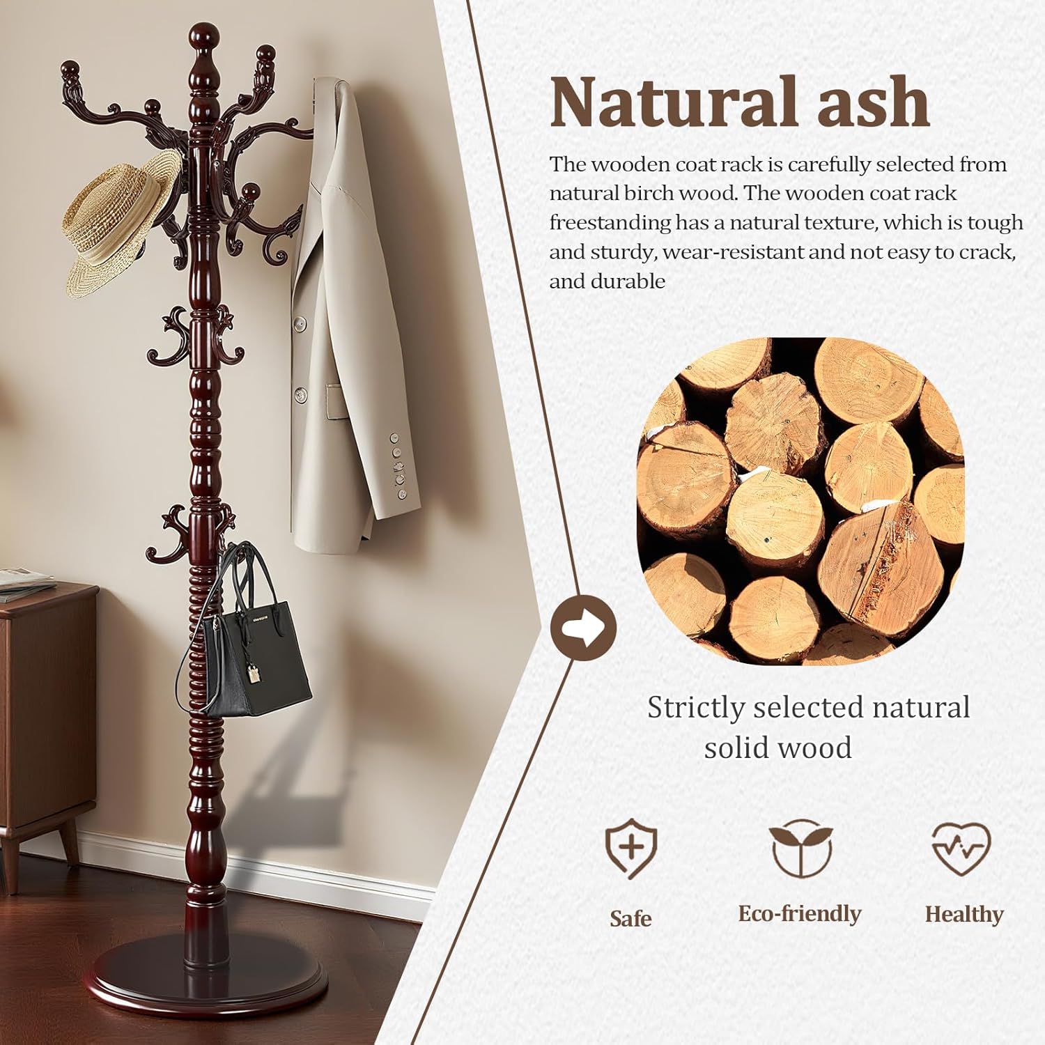 - SAFE, DURABLE CRAFTSMANSHIP: Each wooden coat rack uses high-quality natural solid wood, polished by artisans for a splinter-free surface, then finished with non-toxic eco-friendly paint. This ensures the coat rack is safe for homes with kids/pets, while its robust build guarantees long use. The warm wood tone of this coat rack freestanding adds coziness, turning storage into a space-enhancer. Unlike flimsy options, this wooden coat rack won’t warp or break, and its vintage look grows charm over time. This coat rack balances safety, durability, and style in busy entryways or quiet bedrooms.