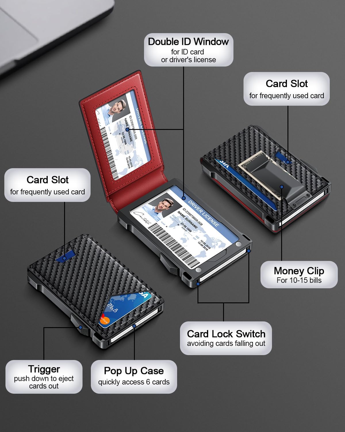 - QUICK CARDS ACCESS: This minimalist wallet for men features a smooth pop-up mechanism. Just press the side button, and the cards slide out in a stepped layout for easy access.
