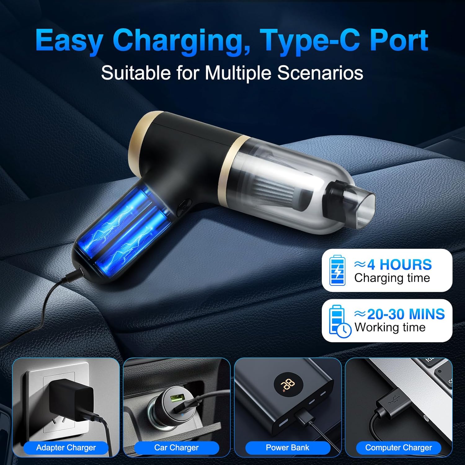 - 【Type-C Fast Charging & Long-Lasting Battery】Equipped with a 4000mAh rechargeable battery and Type-C charging port, this cordless vacuum in just 4 hours and provides up to 30 minutes of runtime. It can be charged via computer, car charger, or power bank, offering true cordless freedom and convenience