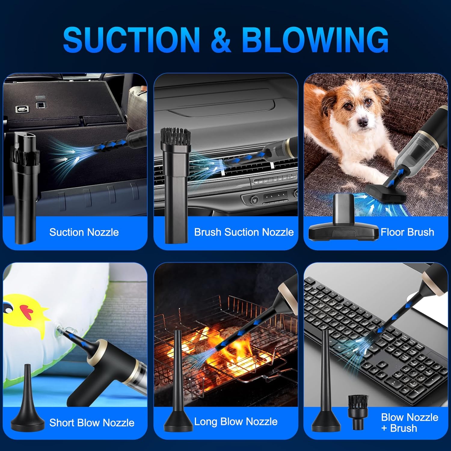 - 【Multi-Nozzle Set for Versatile Cleaning】Includes multiple attachments such as a crevice tool, brush head, and inflator nozzle, making it ideal for cleaning cars, sofas, keyboards, air vents, pet areas, and more. Whether for suction, blowing, or inflating, this vacuum adapts to all your cleaning needs at home, in the office, or on the go