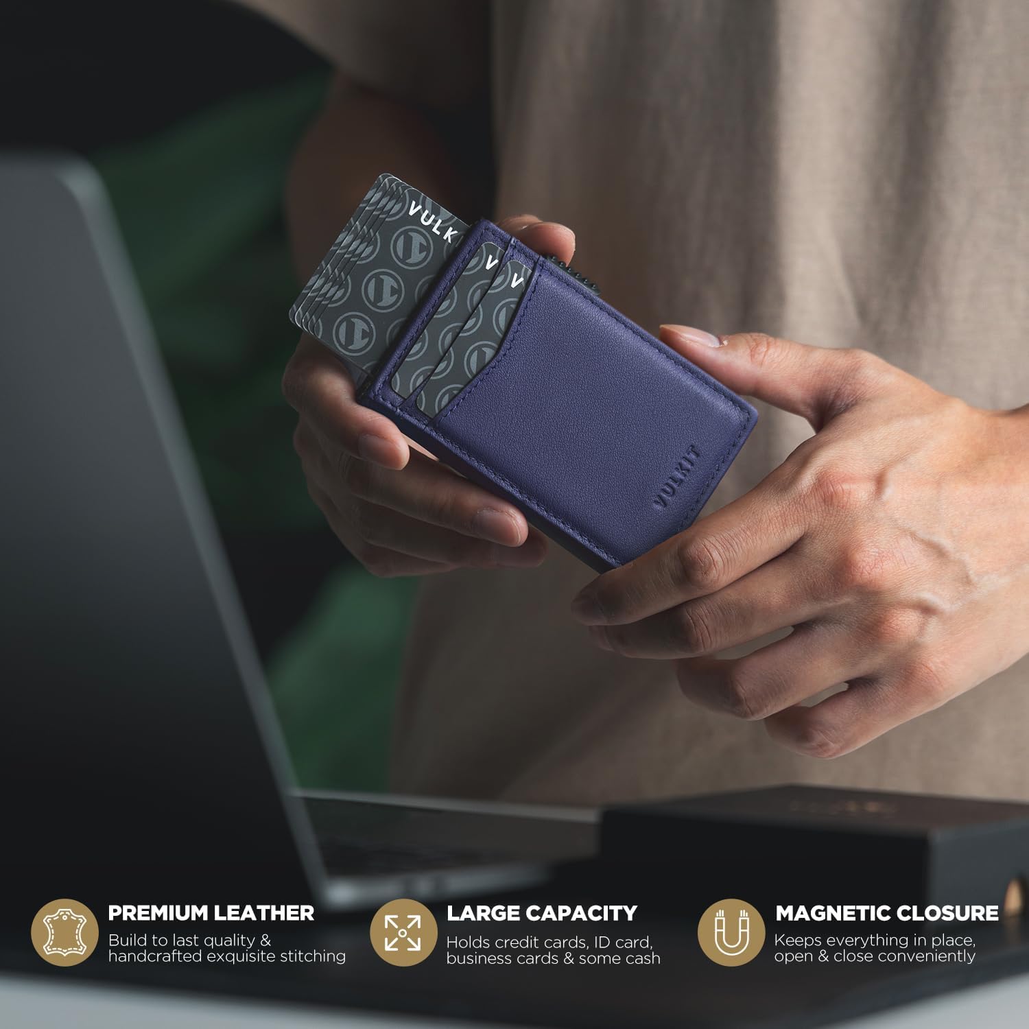 VULKIT Men's Wallet with ID Window Top Grain Leather RFID Blocking Minimalist Wallet Pop Up Card Holder Magnetic Closure