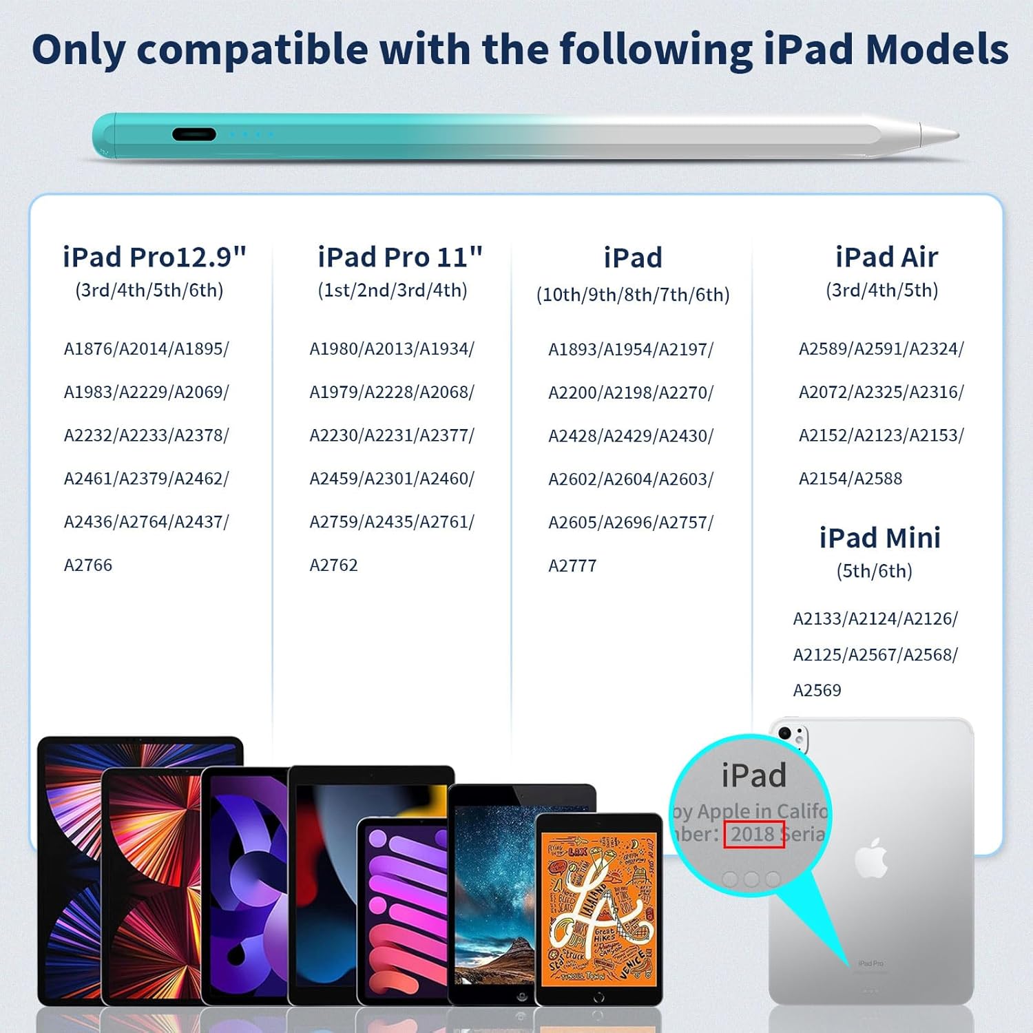 - 【Compatibility Check Needed】 This Apple pen is designed exclusively for iPads released in 2018 and later. Compatible models: iPad Pro 11" (All Generations), iPad Pro 12.9" (3rd to 6th Gen), iPad 10th/9th/8th/7th/6th Gen, iPad Mini 5th and 6th Gen, and iPad Air 5th/4th/3rd Gen. Not valid for other models such as iPad versions prior to 2018, iPhone, Android and Microsoft devices, please check the correct model number before ordering