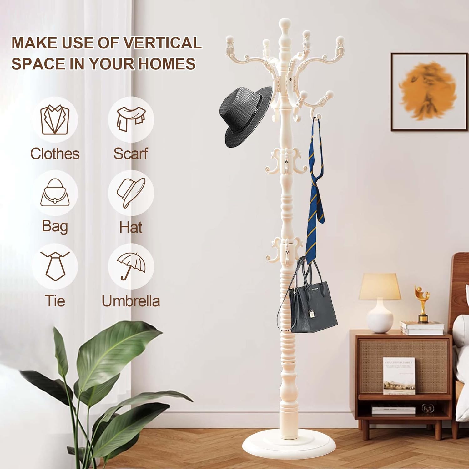 - VINTAGE COAT RACK with 18 HOOKS: The coat tree freestanding has 18 exquisite resin classic hooks, smooth burr-free edges, protects clothing from damage. The hooks evenly distributed to hold coats, bags, hats, ties and accessories without tangling. Make use of vertical space in your homes, is perfect choice to tidy up yourmessy room