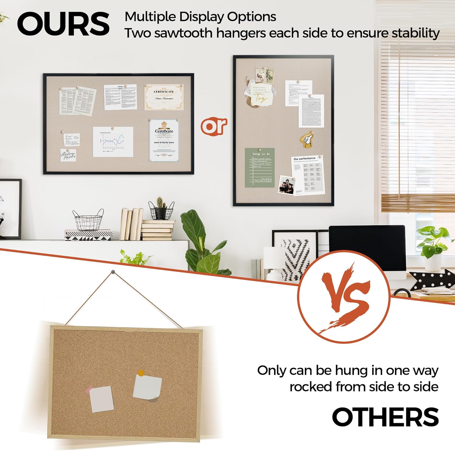 - Large 24x36 Inch Bulletin Board with Complete Accessory Kit:Generous 24x36 inch cork board provides ample space for memos, photos, and schedules. This value-packed set includes rust-resistant thumbtacks, sturdy hooks, and hanging strings—everything you need to start organizing right away. Ideal for large wall displays in offices, classrooms, or homes.